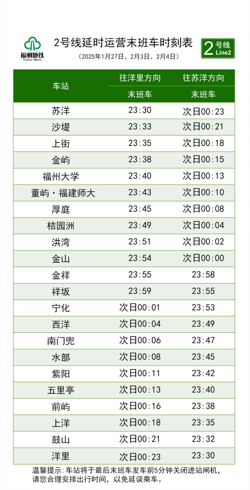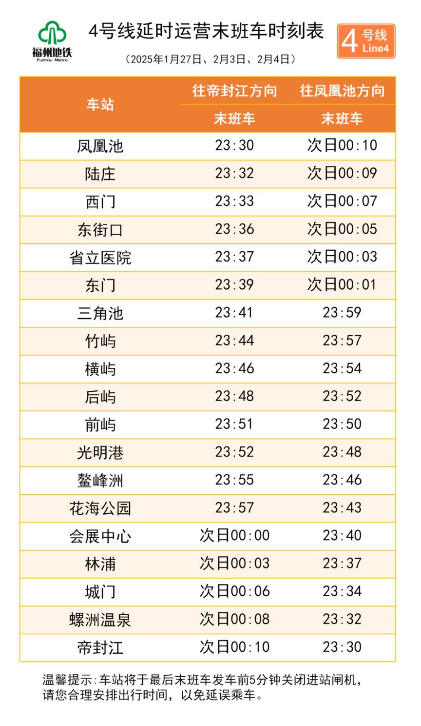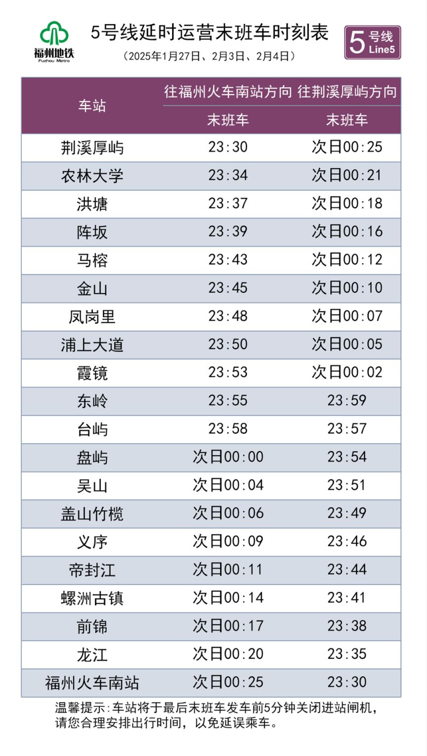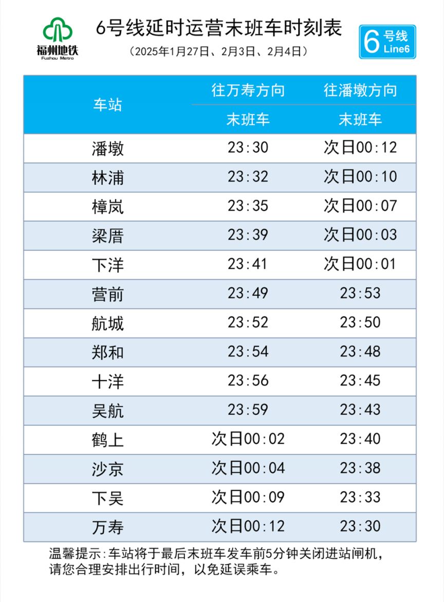 示例:2025年春节福州地铁延时运营时刻表