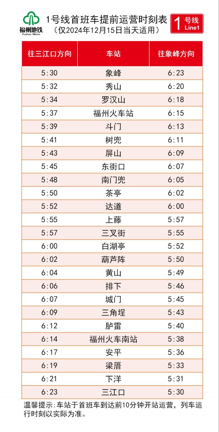 12月15日赛事当天,1号线、2号线、4号线将提前1小时开始运营,首班车于5:30始发(首班车时刻表详见下图),各车站于首班车到达前10分钟开站运营。