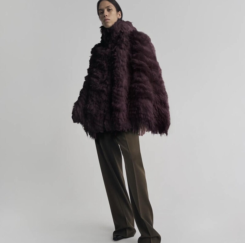 长如地毯的绒毛材质在Phoebe Philo的首个作品中扮演重要亮点角色,以大面积的方式铺张在大夹克、西装裤上。