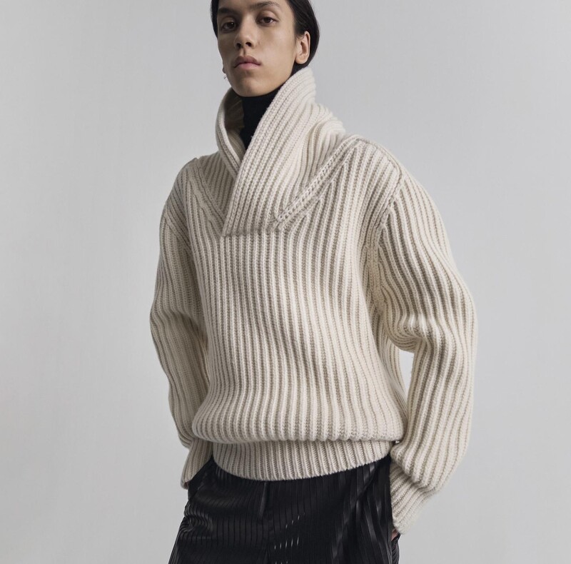 Phoebe Philo推出的针织单品系列,在基础之上加入了她的极高的辨识度,以粗针织的方式强调纹路,让针织毛衣与围脖合为一体,另外也使用异材质拼接方式,凸显细节控的坚持之处。