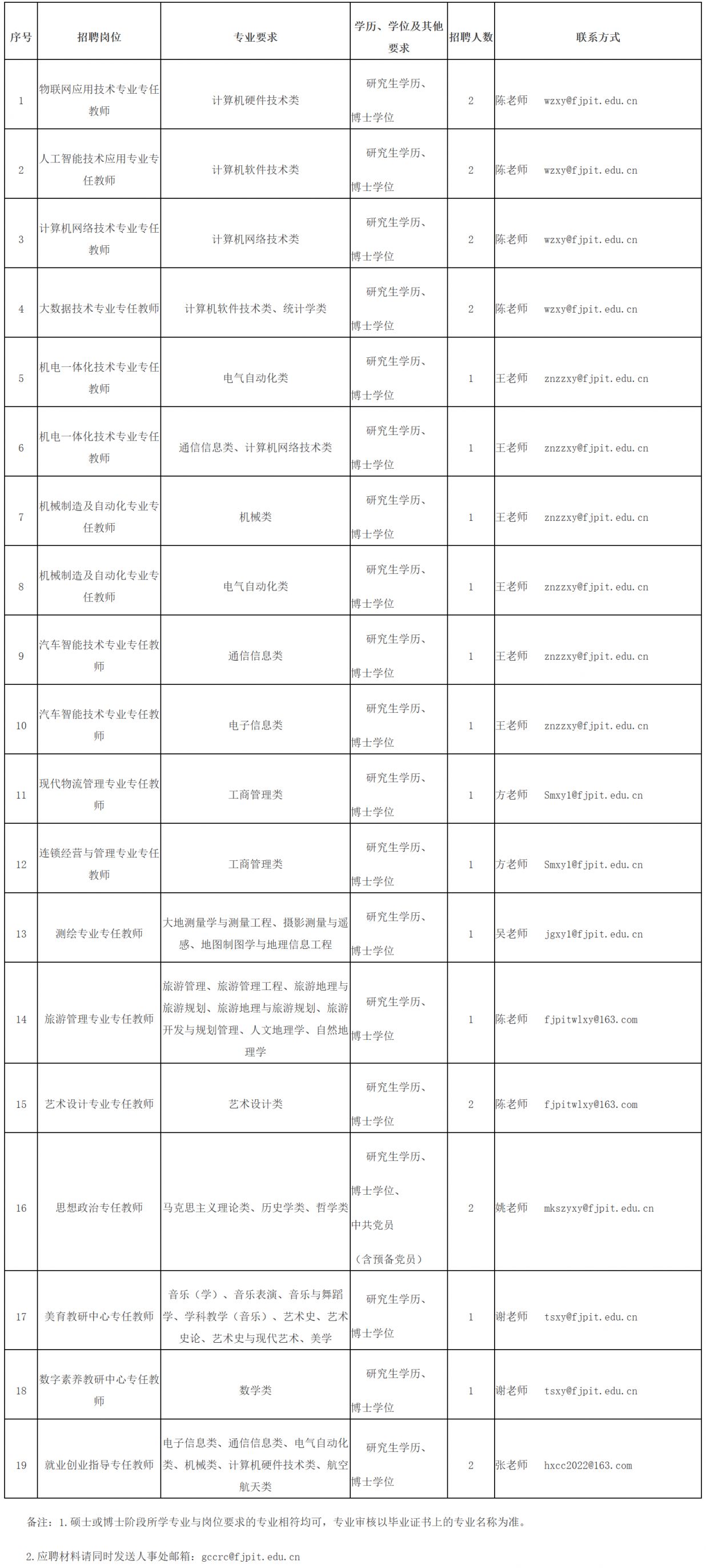 福建信息职业技术学院是首批“国家示范性高等职业院校建设计划”骨干高职院校、全国200所优质专科高等职业院校、福建省示范性现代职业院校建设工程重点建设院校、“双高计划”高水平专业群建设单位(A档),是一所以工科为主、商旅文创相结合,以信息技术和闽台合作为特色的全日制普通高职院校。学校坐落于历史文化名城、全国文明城市、福建省省会福州市,现有位于福州市区的龙腰校区、杜园校区以及位于平潭综合实验区、国际旅游岛的占地1100亩的平潭新校区。根据学院发展需要,拟向社会招聘高层次人才26名。根据《福建省省属事业单位公开招聘工作人员考试暂行办法》的规定,制定具体方案如下: 一、基本条件 1.具有中华人民共和国国籍,拥护中国共产党的领导,热爱社会主义,遵纪守法,品行端正。 2.政治素质好,热爱教育事业,具有良好的职业道德,身心健康,学风正派,治学严谨,团结协作精神和组织协调能力强。 3.熟悉本专业发展前沿,能准确地把握专业发展方向,科学研究能力强,有一定的学术研究成果,胜任相关科研平台建设与管理工作,胜任核心课程教学工作。 4.身体健康,体检标准及项目参照福建省教师资格申请体检标准及项目执行。 5.年龄要求:博士研究生年龄要求为18周岁以上、40周岁以下(1984年6月至2007年6月期间出生);且具有副高级专业技术任职资格报考者年龄可放宽至45周岁及以下(1979年6月至2007年6月期间出生);且具有正高级专业技术任职资格报考者年龄可放宽至50周岁及以下(1974年6月至2007年6月期间出生)。 6.取得境外学历学位证书报名者应提供教育部留学服务中心出具的学历学位认证书。其中,学历资历要求为博士研究生的,原则上,本科阶段需为全日制本科,且博士研究生需毕业于国际知名四大世界大学排名之一最新排名前500的大学,或所学专业在国际知名四大世界大学排名之一最新学科排名前100。国际知名四大世界大学排名以ARWU世界大学排名、QS世界大学排名、THE世界大学排名、U.S.News世界大学排名为准。 7.毕业证书、学位证书、认证书等各项资格认定落款截止时间为2026年3月31日。 二、招聘岗位及要求  三、信息发布 招聘信息在福建省人力资源和社会保障厅网站、福建省教育厅网站、福建就业网(http://220.160.53.33:8903/)、福建信息职业技术学院网站(首页人才招聘栏目)公开发布。 四、报名和资格审查 1.报名时间:即日起至2026年3月31日,原则上每季度组织一次面试,择优筛选,招满即止。 2.报名方式:符合条件的报考人员请于报名截止之日前将报名材料以“高层次-姓名-报考岗位名称)命名压缩,打包发送各应聘岗位联系人邮箱,并同时发送福建信息职业技术学院高层次人才招聘邮箱。邮件收到后,工作人员均会在十个工作日内给予回复,如未收到回复,可以拨打人事处联系电话,以确认报名材料是否成功接收。报名材料包括: (1)《福建信息职业技术学院高层次人才应聘报名表》(含照片、附件1)、《福建信息职业技术学院应聘人员报名汇总表》(附件2)。 (2)身份证扫描件PDF(大小与原件一致,正反在同一页面); (3)学历,学位(含前置学历到最高学历)证书扫描件PDF及对应的教育部学历证书电子注册备案表(需在有效期内,可扫码验证)、学位在线验证报告(学信网https://www.chsi.com.cn),暂未取得招考职位要求的毕业证书或学位证书的应届毕业生应提供学籍在线验证报告(学信网);取得境外学历学位报考者应提交教育部留学服务中心学历学位认证书扫描件PDF; (4)已参加工作的报考者,需提交现工作单位人事主管部门出具的同意报考证明(或与单位解除劳动、聘用合同关系的证明),其中,在编人员须在报名时同时提供所在单位人事主管部门出具的同意报考证明;其他人员若暂时无法提交,经我校人事处同意后最迟可延至考察前提交; (5)专业技术任职资格证明材料扫描件PDF(副高级及以上专业技术任职资格报考者须提供); (6)近5年学术成果、获奖证书和相关证明扫描件PDF; (7)诚信考试承诺书(见附件3)。 3.资格审查:收到简历后根据应聘者学术水平择优筛选,资格审核贯穿本次招聘全过程,报考人员应严格按照招聘岗位的条件要求报名,并对提交材料的真实性、合法性负责。凡个人填报信息不实,不符合招聘岗位要求的,一经核实,即取消考试或聘用资格。资格审核贯穿本次招聘全过程。报考人员所留联系方式应准确无误并确保招聘期间保持通畅。 五、面试、考察 根据福建省省属事业单位招聘高层次人才有关规定,此次招聘考试采取面试、考察的方式确定拟聘人选。面试由学术汇报、现场答辩两个环节组成。面试前,由学术委员会对应聘人员近五年以来的学术成果进行审核,对持有副高级及以上专业技术任职资格的应聘者,按照学校相应专业技术岗位任职条件进行学术水平认定。认定通过后,参加面试、考察。 我校组织面试工作小组进行面试,面试合格分数线为70分。根据面试成绩高低,按岗位招聘人数1:1的比例确定考察人选。考察前需提交《无犯罪记录证明》。 学校组成2人及以上考察小组对考察对象进行考察,通过查阅档案、个别谈话等方式全面了解考察对象的政治思想、道德品质、能力素质、学习和工作表现、遵纪守法等情况,并形成书面考察意见和结论。经考察不合格的,不予聘用。 六、体检 1.根据面试、考察结果,按岗位招聘人