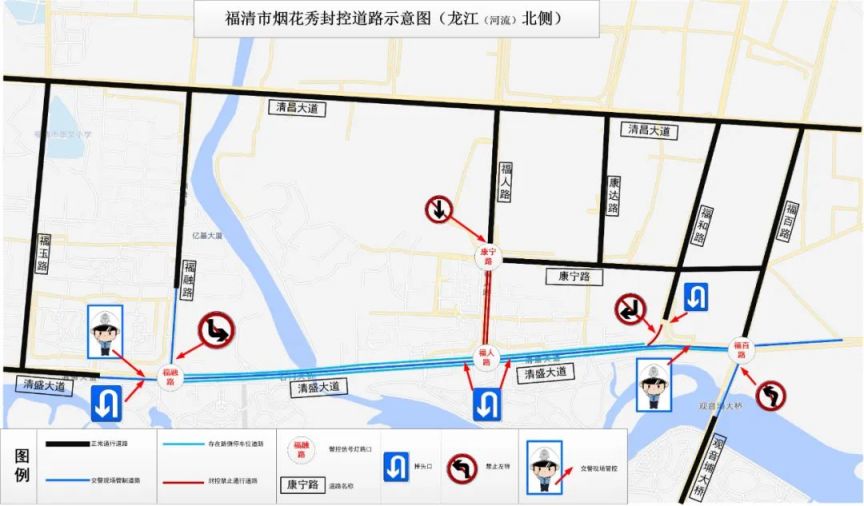 19:00至21:00,将对清盛大道(福融路至福和路)、福人路(康宁路至清盛大道)实行临时交通管制,将清盛大道(福融路至福百路)路段设置为临时停车区域。
