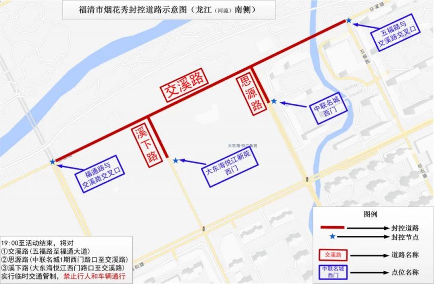 19:00至活动结束,将对交溪路(五福路至福通大道)、思源路(中联名城1期西门路口至交溪路)、溪下路(大东海悦江西门路口至交溪路)实行临时交通管制,禁止行人和车辆通行。