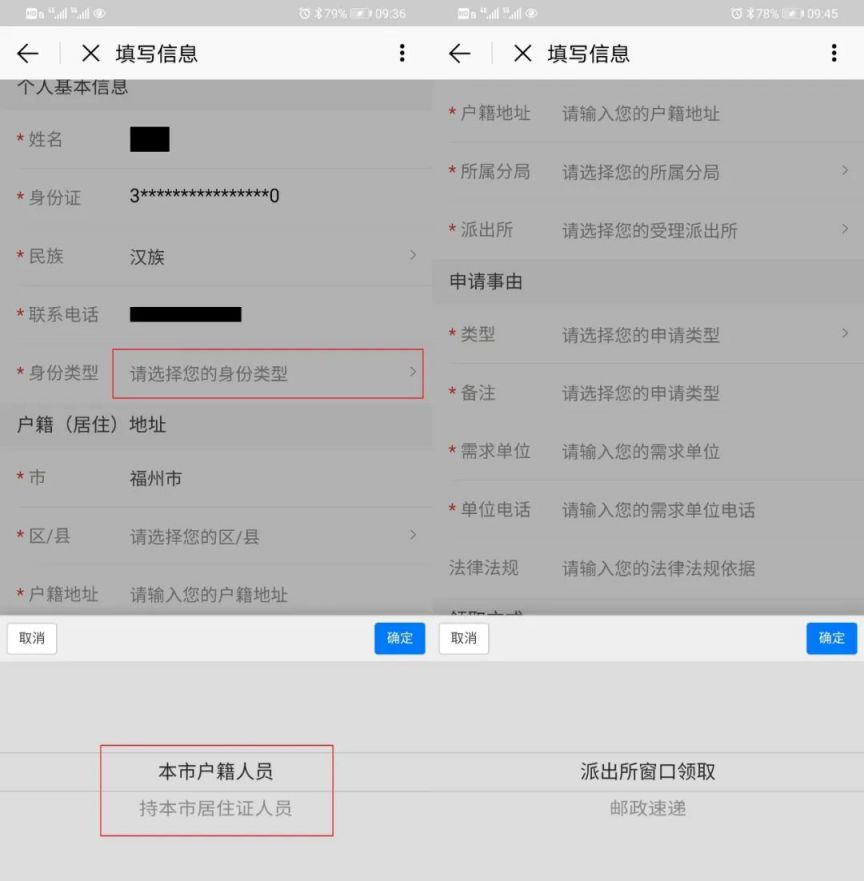 (1)填写个人信息,注意填写身份类型,分为本市户籍人员和持本市居住证人员,选择对应的户籍地派出所或居住地派出所。