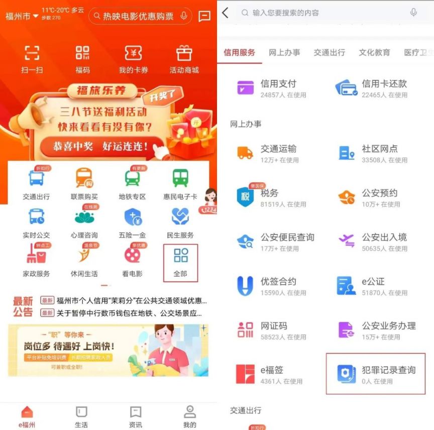 1.登录“e福州”APP,在“网上办事”类别中找到“犯罪记录查询”模块,点击即可进入申请。